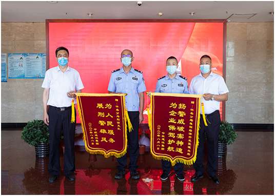 培训中心主任孔德明代表九游j9官方登录入口-九游j9(中国)向怀柔分局雁栖经济开发区派出所所长和怀柔分局刑侦支队支队长送上锦旗,代表公司感谢人民警察服务企业生产建设、守护一方平安付出的艰辛努力,感谢怀柔分局雁栖开发区派出所和怀柔分局刑侦支队急企业所急、想人民所想,在企业遇到困难时及时出警,有力保障了企业财产安全,维护了社会良好秩序,为企业发展创造了平安和谐的营商环境。